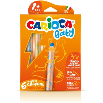 Fără TVA:23,20€Creioane colorate CARIOCA Baby 1+, 3 in 1, 6 culori/cutie, ascutitoare inclusa