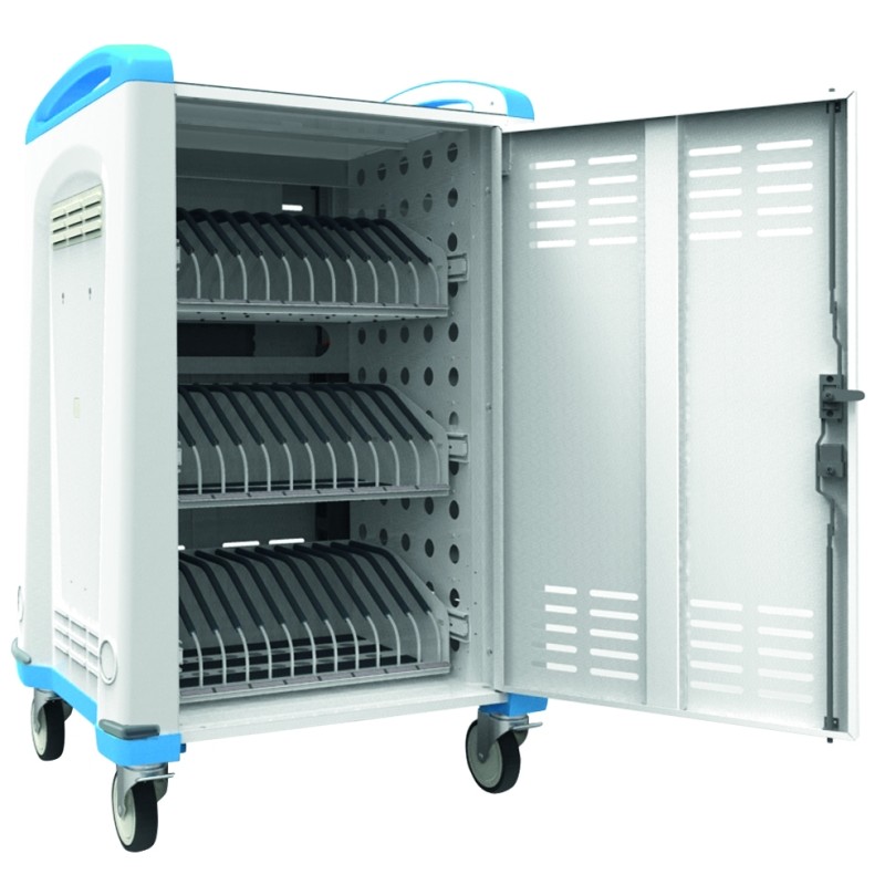 Pot fi stocate 36 de tablete cu legatura standard de priza de perete, printrun sistem sigur si controlabil de incarcare.