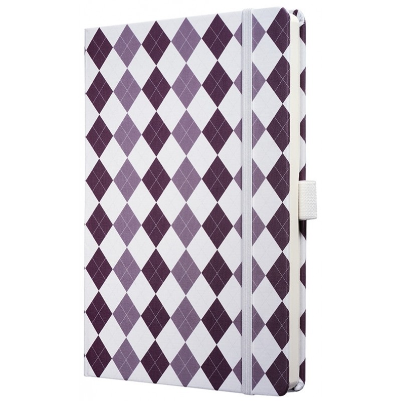 Prevazut cu pagini numerotate, 2 snururi pt. semn, 2 buzunare interioare pe coperta, suport instrument de scris, inchidere cu elastic.