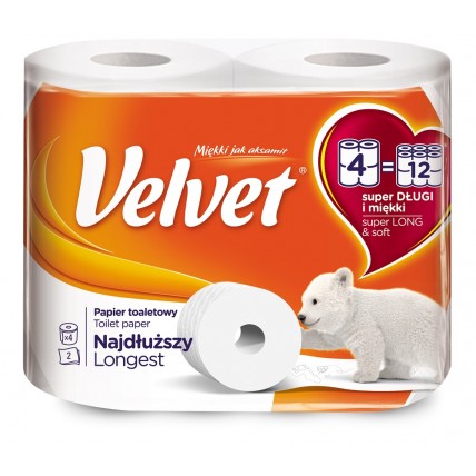 # Cea mai lunga rola din gama de hartie igienica Velvet. Hartia moale, cu doua straturi, este decora..