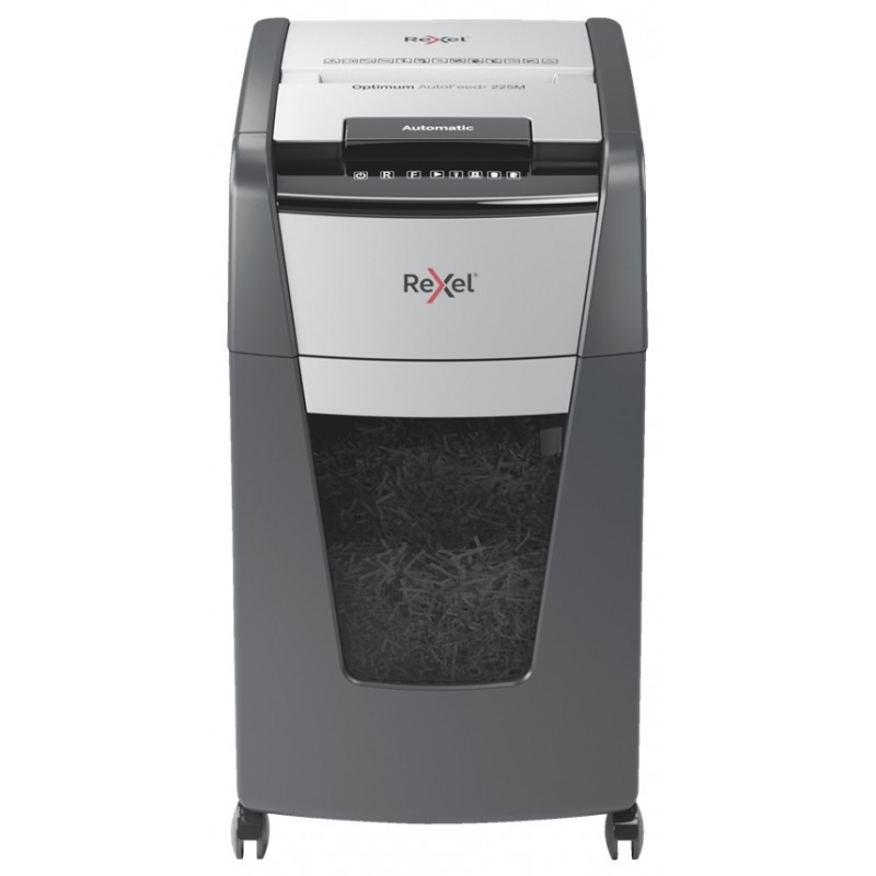 Cod produs:RX-2020225MEUDistrugatorul automat pentru documente Rexel Optimum AutoFeed+ 225M distruge automat 225 coli A4 (80 gsm) dintr-o singura incarcare, in bucati de 2x15 mm (P-5, micro cut).
