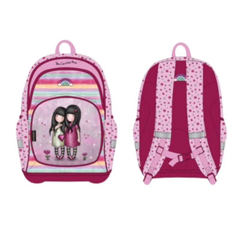 Ghiozdanul Santoro Gorjuss are 2 compartimente principale cu fermoar; buzunar mare frontal cu fermoar; buzunar mic frontal cu inchidere cu fermoar, buzunare laterale;