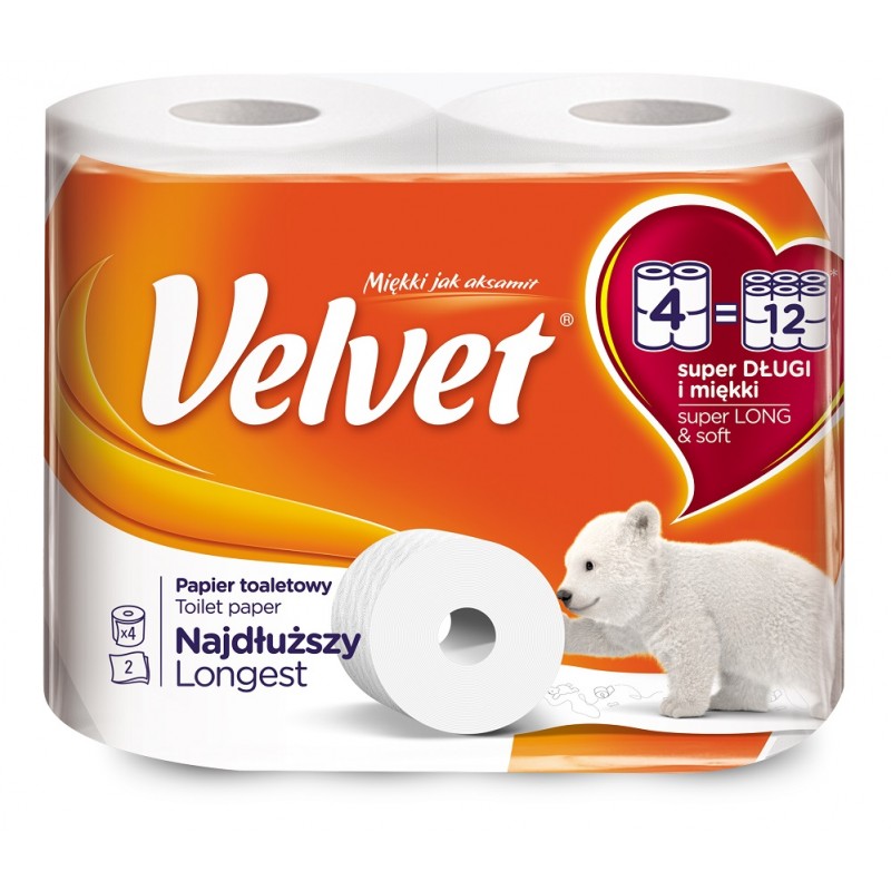 Hartie igienica alba, 2 straturi, 486 de portii, 4 role/bax (echivalent 12 role), VELVET Longest
