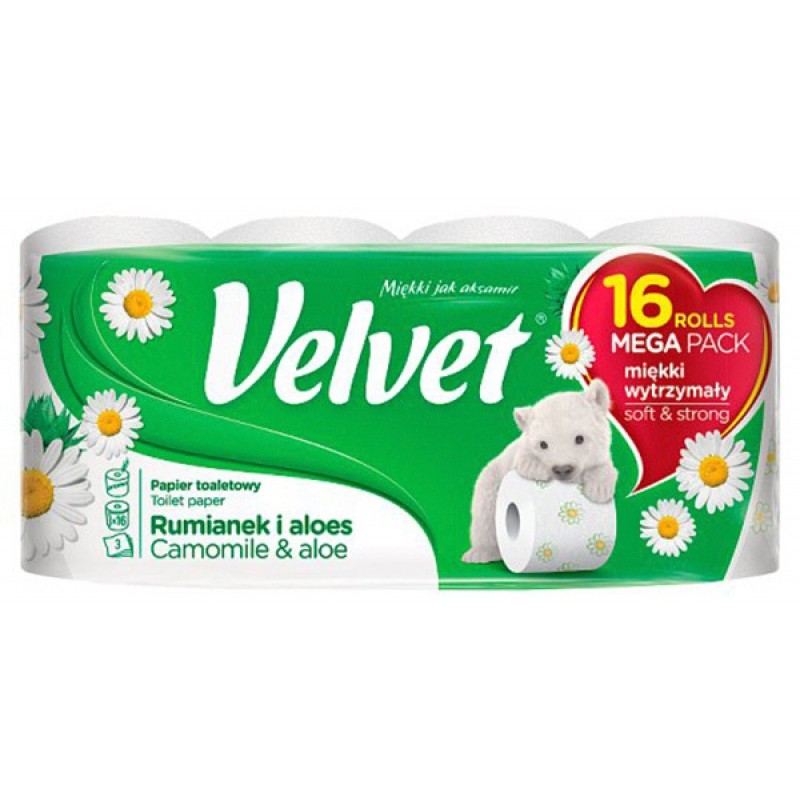 Hartie igienica alba, 3 straturi, 140 de portii, 16 role/bax, VELVET Mega Pack - Camomile & Aloe