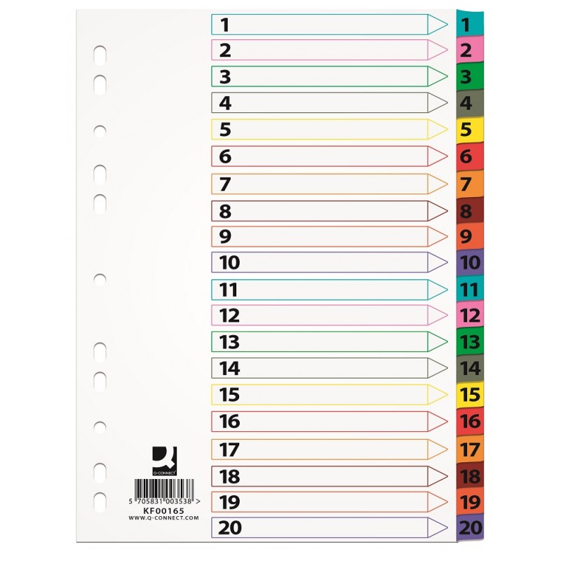 Index carton alb Mylar numeric 1-20, margine PP color, A4, 170g/mp, Q-Connect