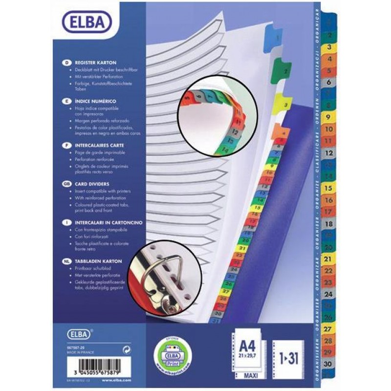 Index carton alb Mylar numeric 1-31, margine PP color, A4 XL, 170g/mp, ELBA