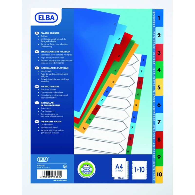 • Index plastic color numeric 1-10, A4 XL, 120 microni, ELBA