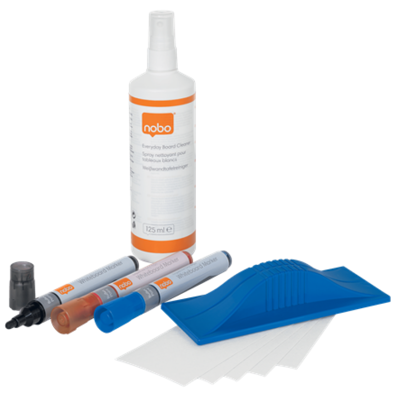 Kit pentru tabla NOBO, 3 markere diverse culori, burete magnetic + rezerva, spray curatare 125 ml