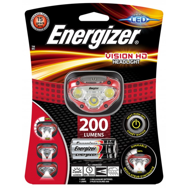 • Lanterna de cap Vision HD Headlight rosie, 200 lumeni, raza de 50m + 3 baterii AAA, Energizer