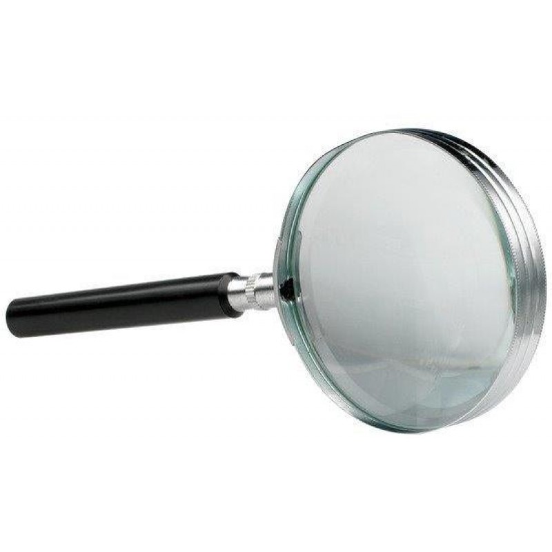 Lentila din sticla, cu rama si maner negru din plastic.