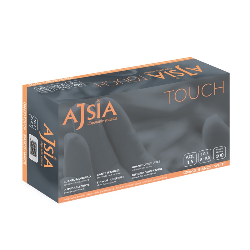 Manusi vinil AJSIA Touch, unica folosinta, nepudrate, 0.08mm, 100 buc/cutie - albe - marime L
