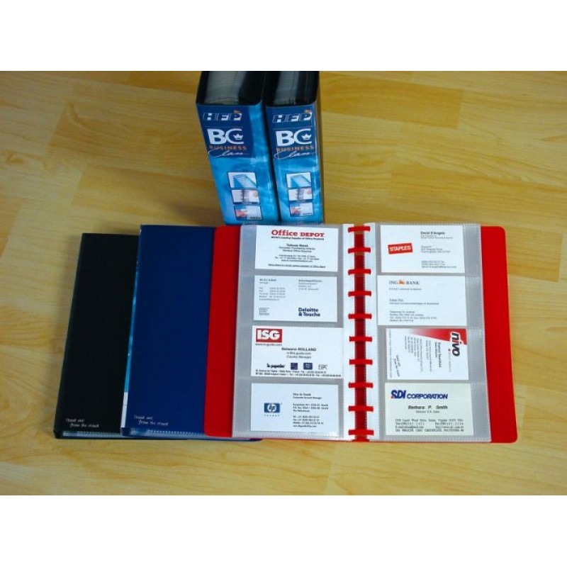 Contine folii transparente a cate 8 carti de vizita fata/ verso (95 x 60 mm) si index alfabetic A - Z.