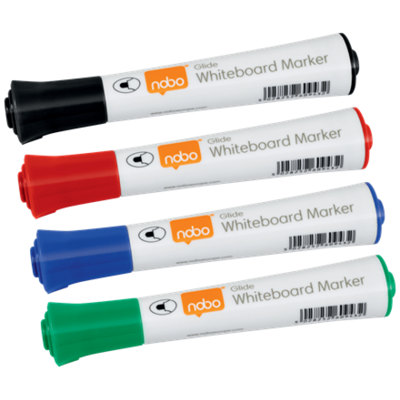 Markere glisante NOBO Glide jumbo, cu linii groase si precise, atunci cand sunt folosite pe tabl si suprafete precum tablele din sticla sau otel emailat.