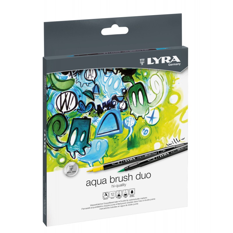 Markere LYRA Aqua Brush Duo, 2 capete (brush + 1mm), 12 culori/cutie