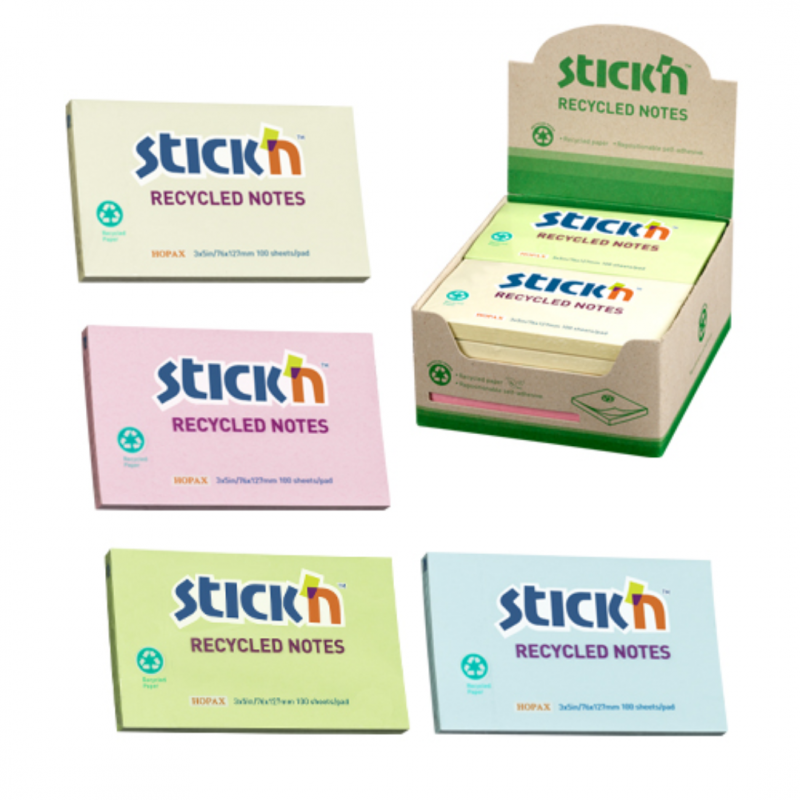 • Notes autoadeziv 76 x 127 mm, hartie reciclata, 100 file, 12 buc/cutie, Stick"n – 4 culori pastel