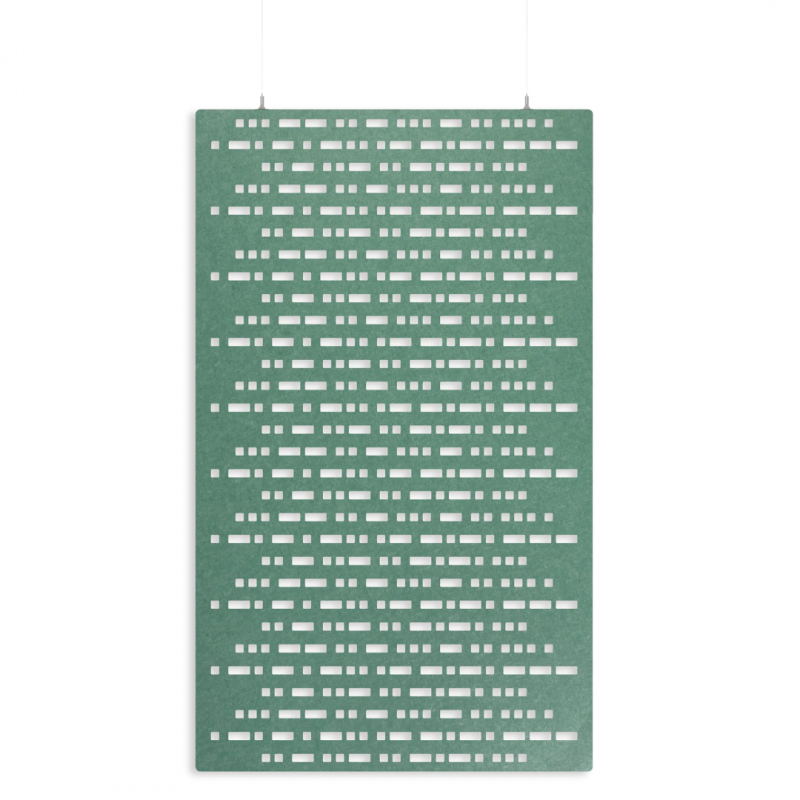 Cod produs:11209060Un perete de separare acustic in culoarea verde ""petrol"", fabricat din felt de 18 mm grosime, cu un model transparent. Feltul absoarbe sunetele enervante si ecourile neplacute. Montajul pentru tavanul suspendat si tavanul fix este inclus. Fixarea poate fi ajustata pana la o inaltime maxima de 2 metri sub tavan. Materialul din felt este sustenabil, fiind fabricat din sticle de PET reciclate.