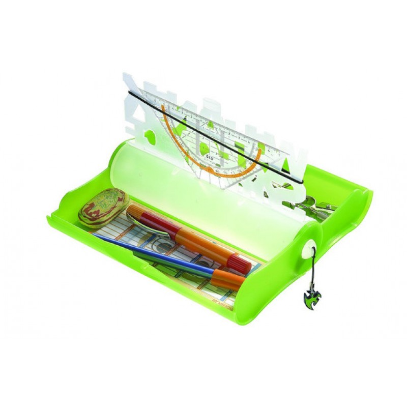 Incapator pentru creioane, pixuri, markere, foarfeci, rigla si alte obiecte; echerul de desen se poate fixa intr-un spatiu dedicat.
