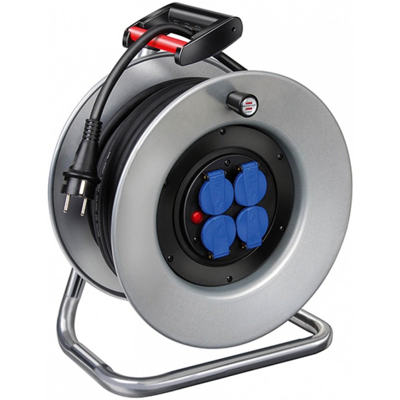 • Prelungitor cu roata metalica, BRENNENSTUHL, 4 prize laterale cu capac, cablu 25 m - negru/argintiu