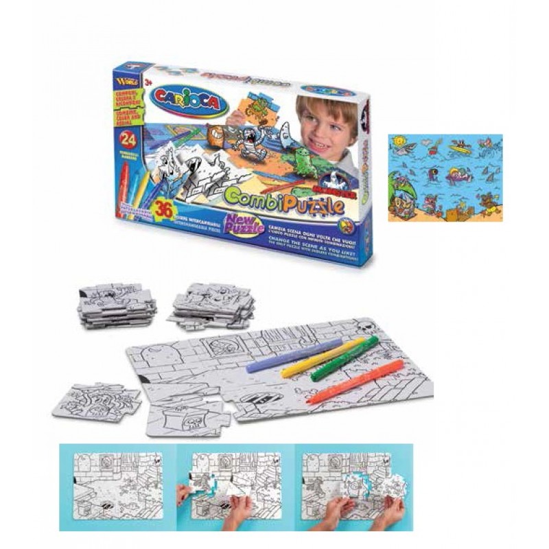 CombiPuzzle este disponibil în 4 teme diferite, iar fiecare pachet contine 36 de piese si 24 carioci cu cerneala lavabila.