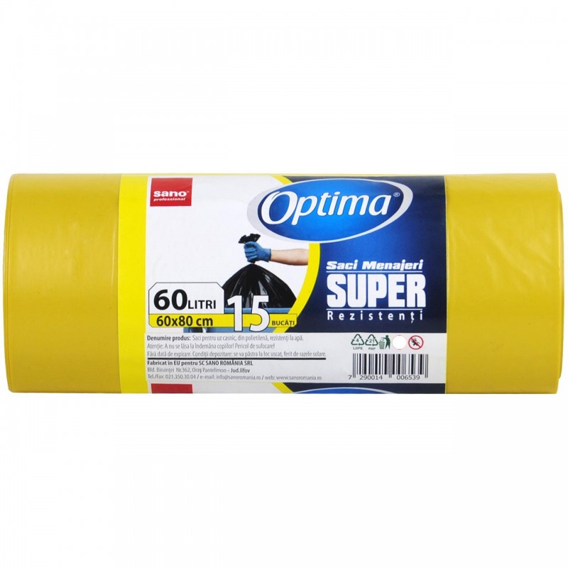Saci menaj super rezistenti 60L, 15buc/rola, Sano Optima - galbeni