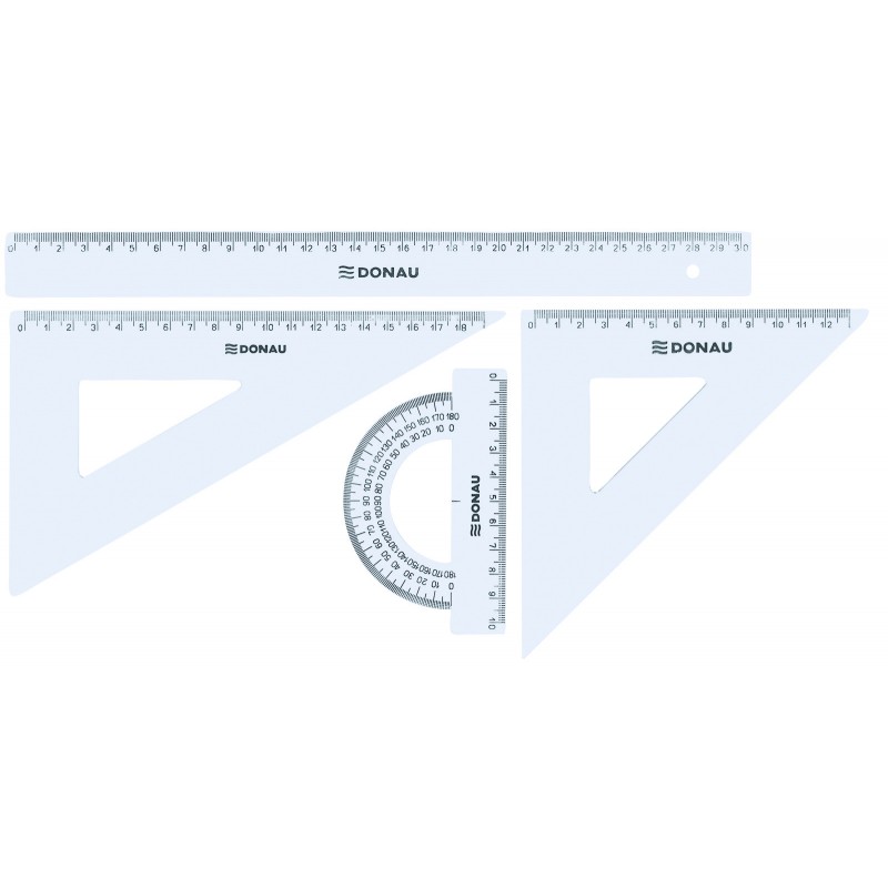 Set geometrie mare, contine: rigla 30cm, raportor, echer 13cm si echer 19cm, DONAU - transparent