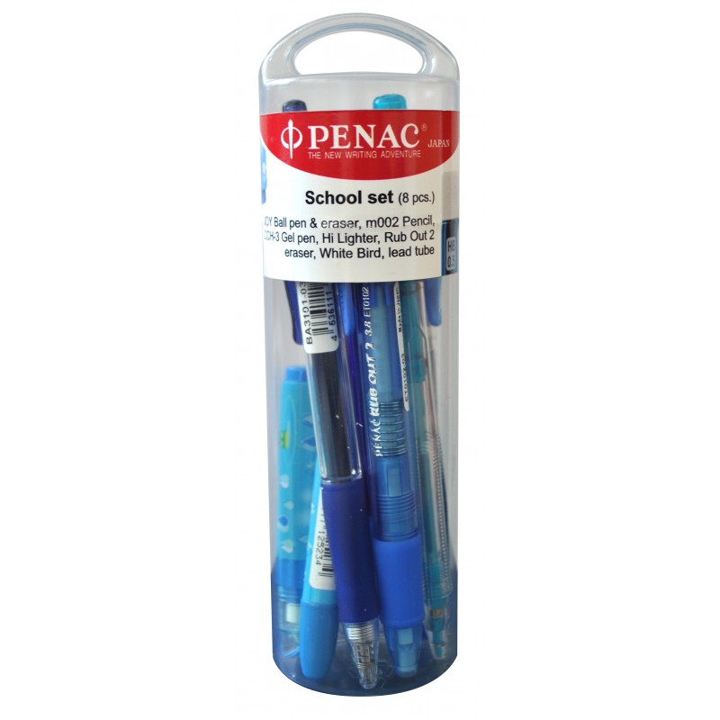 Contine : pix Joy, radiera stick Joy, creion mecanic M002, pix cu gel CCH-3, textmarker, radiera rub out, dispenser corector, rezerve mine creion mecanic de 0.5 mm